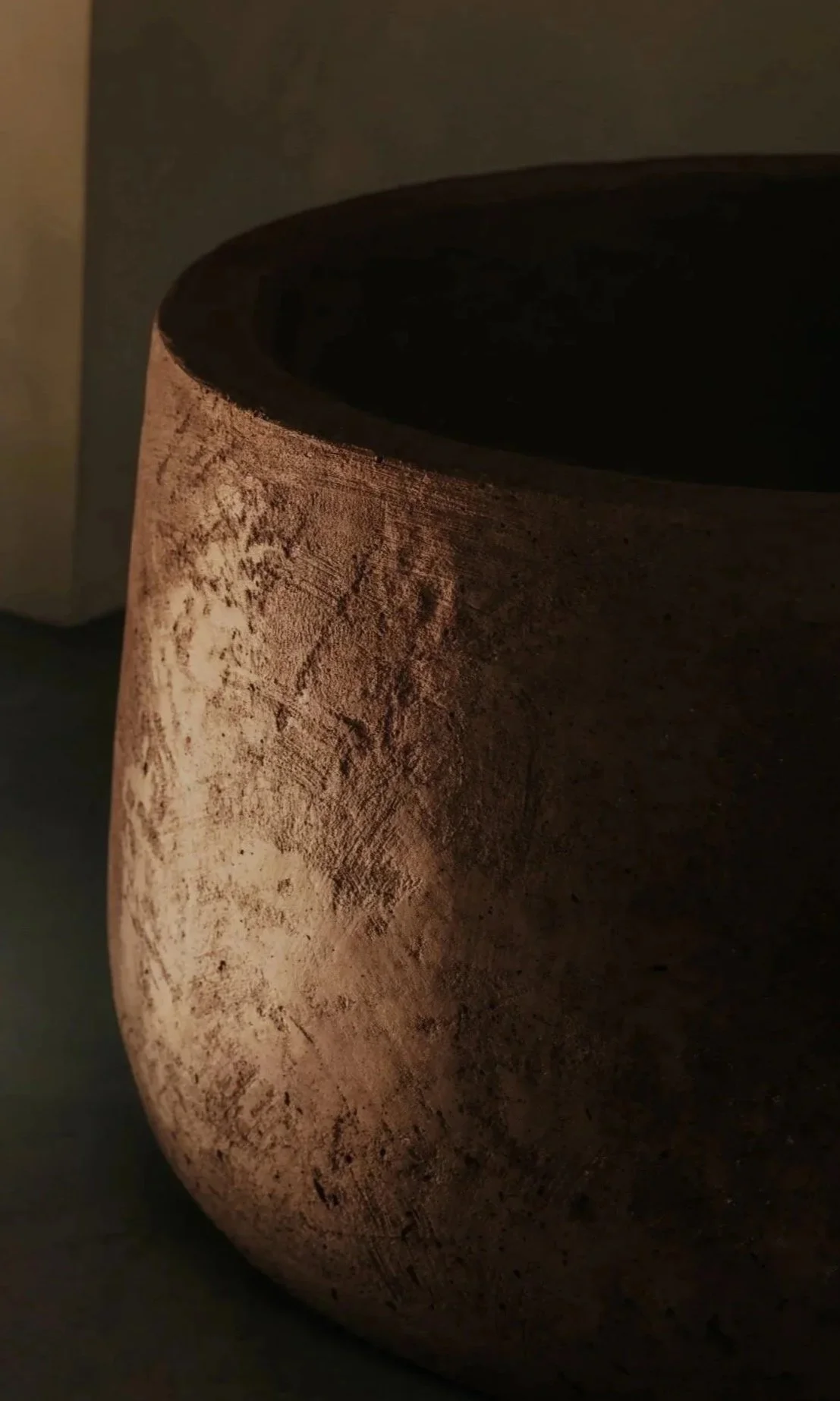 Tree pots formed from reclaimed concrete and recovered building materials.